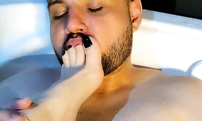 He luvs to lick, kiss and smell my feet and he can't stop cumming on them