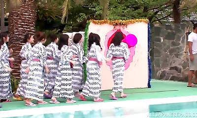 A gang of Japanese individuals engage in an outdoor sexual act featuring Sara Saijo, a jaw-pulling down and alluring Asian female.