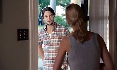 Jess Weixler bare lying on her back as a man squeezes and